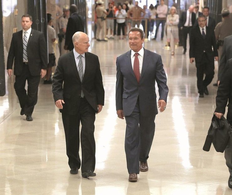 Во второй раз Джерри Браун (слева) играет роль губернатора увереннее. В отличие от предшественника, Арнольда Шварценеггера, ему ни дня не нужно учиться / Фото: AP
