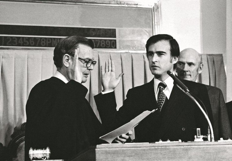 6 января 1975 года молодой губернатор Джерри Браун (справа) дает присягу, заступая на должность