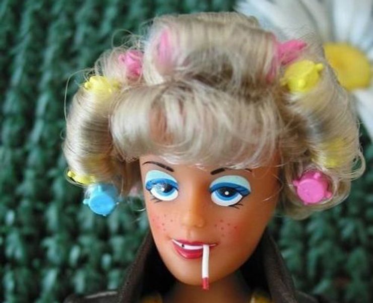 Когда-то эта Барби тоже обладала завидными экстерьерными данными. Она приехала из провинции в Лос-Анджелес, рассчитывая сделать карьеру в Голливуде. Но деньги быстро закончились, Барби устроилась на работу в стрип-клуб, потом спуталась не с тем Кеном, начала выпивать до обеда, расплылась. Она питается фастфудом и не злоупотребляет личной гигиеной. У нее спутанные волосы, застиранная одежда и красноречивый фингал под глазом. В комплект также входят кукольный домик с пришпиленным к двери уведомлением о выселении и игрушечный трейлер, в котором она теперь будет жить.