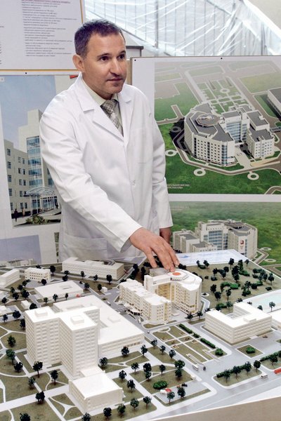 Борис Тодуров демонстрирует макет Центра сердца — до открытия клиники полгода (2007 г.)