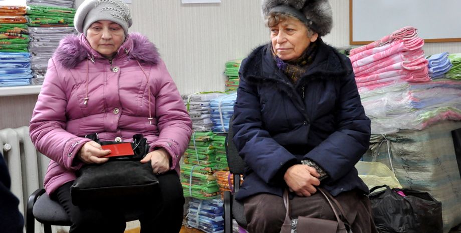 Анна и Наталья – беженцы из Первомайска Луганской области. Вмести прятались от взрывов в подвале. А теперь случайно встретились в Харькове в очереди благотворительного центра, где оказывают помощь переселенцам.