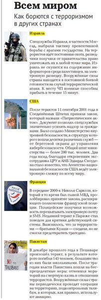 Полезным может быть опыт Израиля. Нужно перенимать систему работы с террористами, которая предполагает активную деятельность. То есть не ждать угроз, а выявлять и просчитывать их, действовать в том числе и на чужой территории, потому что есть базы обучения, например, в Ростовской области.