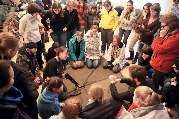 — Когда в город заходит враг, женщинам нужно иметь максимально непривлекательную внешность — простая одежда, грязные волосы, неприятный запах, — подключается другой инструктор, Александр. — Скажу честно, на тренингах мы учим, что в трудных ситуациях лучше описаться, но остаться в живых.