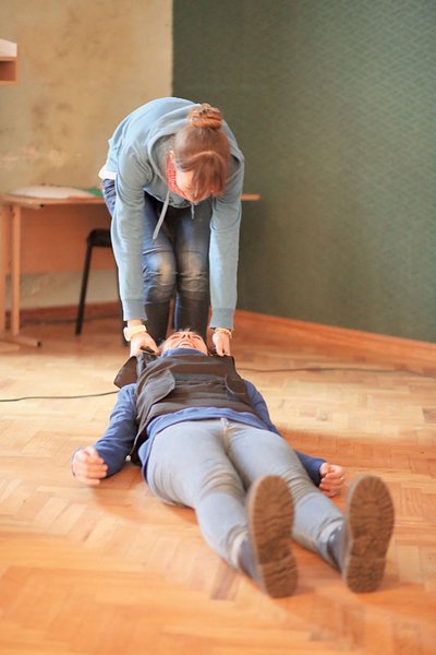 Как спасти солдата, если ты в красной зоне? Я поползла по деревянному полу. Приблизившись к "раненому", ногой загребла его колени, вцепилась в плечо и с усилием закинула на себя. Признаться, мой "раненый" из жалости сам практически на меня перекинулся. Ползти надо на спине, помогая себе руками, — глаза чуть не вылезли из орбит. Наложить жгут было намного проще, но руки все равно дрожали.