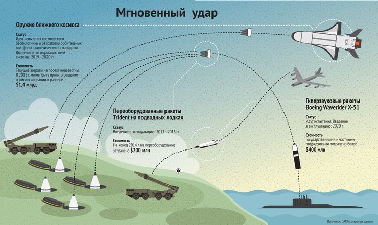 Презентация сценария победы без войны позволила Пентагону в прошлом году получить дополнительные $80 млн на программу Prompt Global Strike ("Молниеносный глобальный удар"), которую американские военные разрабатывают с 2011 года. А общая сумма затрат только на исследования в рамках PGS к концу 2015-го, по данным минобороны США, составит более $2 млрд.