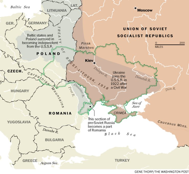 После Первой мировой войны возродившаяся Польша требует возвращения Львова и части территории, относящейся теперь к западу Украины. На этих землях разворачивались ключевые сражения российской гражданской войны. Большевики боролись со сторонниками царской власти и другими политическими оппортунистами. После долгого кровопролития большевики вышли победителями и официально объявили о создании Украинской Социалистической Советской Республики в 1922 году.