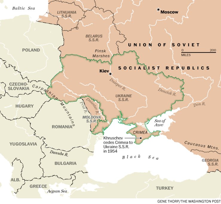 После окончания Второй мировой войны Советский Союз получил Львов и окружающие его земли на западе Украины. Крымский полуостров, население которого было преимущественно русским (после массовой депортации крымских татар), был официально передан Украинской Социалистической Республике в 1954 году советским лидером Никитой Хрущевым.