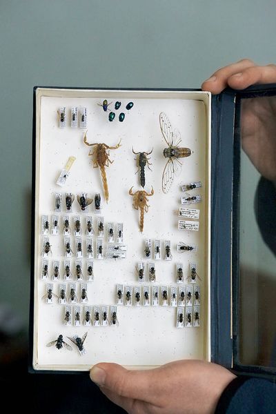 Попов выехал из Донецка в сентябре. Хотел выбраться еще летом, но нужно было перевезти коллекции сирфид. Это пришлось делать в несколько этапов. Коллекция большая и занимает сотню деревянных ящиков — результат 20-летней работы. Попов бережно достает коробки с мухами, немного похожими на пчел.