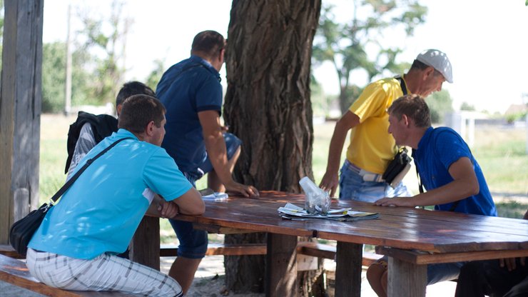 Мы допиваем пиво, направляемся к выходу с вокзальной площади. В тени дерева на небольшой полянке столик и несколько скамеек, на них с десяток мужчин. Под соседним деревом еще один стол, рядом с ним стоит потрепанная "копейка" с крымскими номерами, пылает мангал, пожилой мужчина возится с мясом.