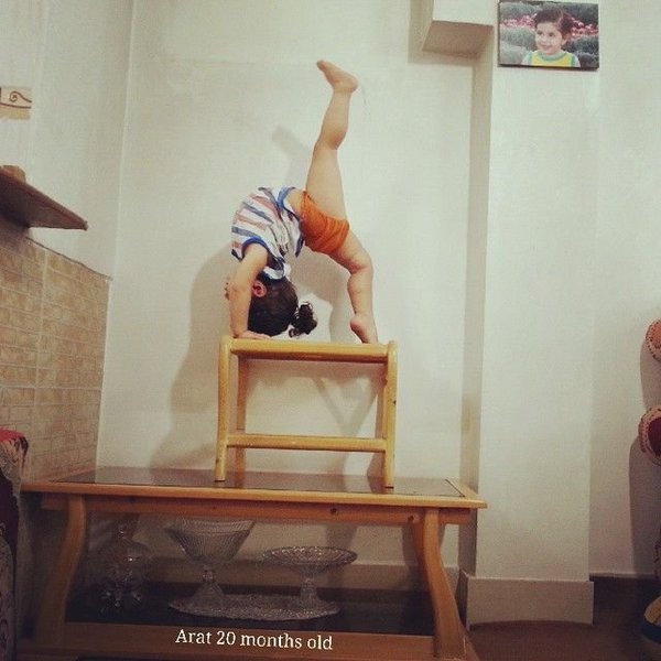Родители заметили способности малыша-гимнаста в возрасте 9 месяцев. С тех пор Арат постоянно совершенствует свои навыки.