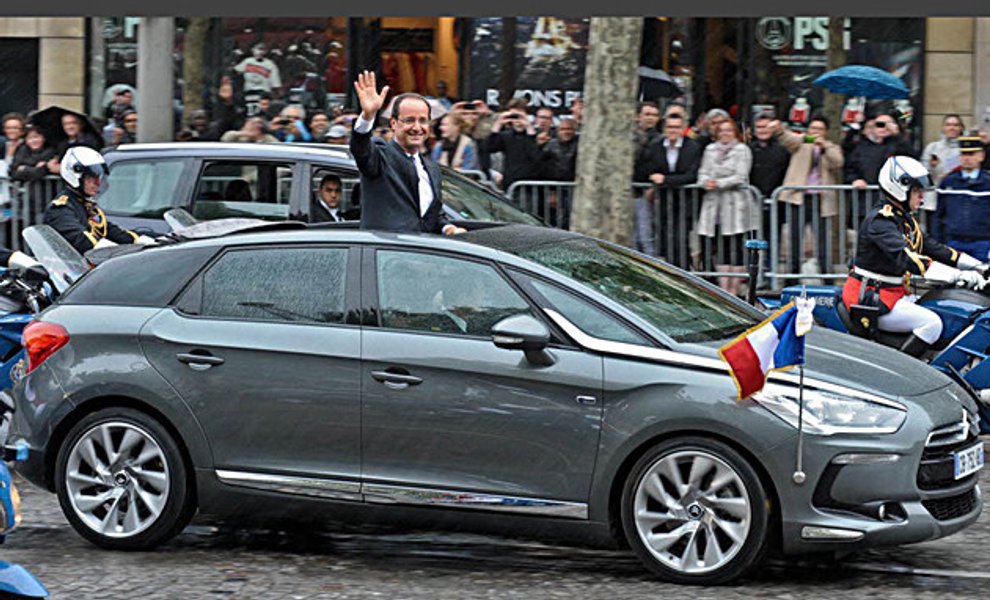 Франсуа Олланд в качестве служебной машины выбрал Citroen DS5 производство Франции. Именно на нем 15 мая он приехал в Елисейский дворец на свою инаугурацию. Глава государства отказался от лимузина в пользу хэтчбека с гибридной установкой, чем продемонстрировал заботу об окружающей среде.