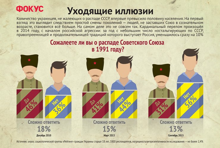 Количество украинцев, не жалеющих о распаде СССР, впервые превысило половину населения. Перелом произошел в 2014 году, с началом российской агрессии