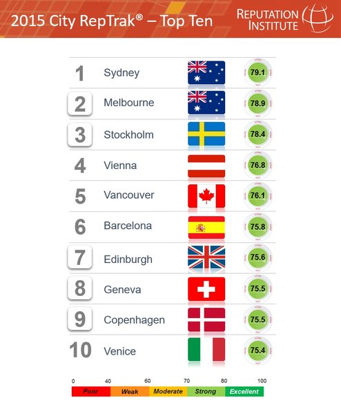 За места в десятке лучших соревновались 15 городов европейских государств. Наиболее комфортным для проживания городом в мире признан Сидней.