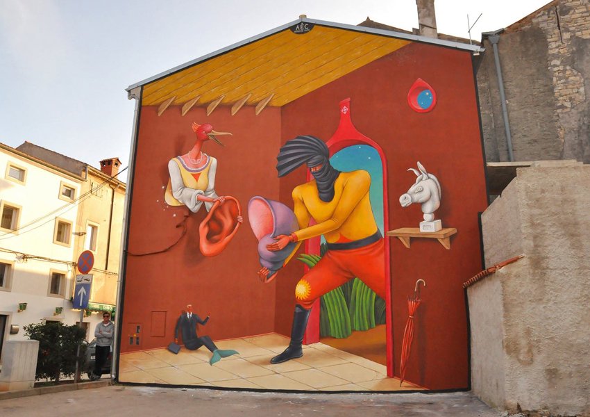 Пожалуй, самый вдохновляющий пример я видел на Сицилии. Я побывал там, где по легенде Одиссей ослепил Полифема, и расписал стену муралом, посвященным этому фрагменту. Конечно, тема зависит не только от места, но и от времени. К примеру, в прошлом году мы обращались к патриотическим символам, такое было настроение. Сейчас я не стал бы этого делать — с патриотическими мотивами и так уже перебор.
