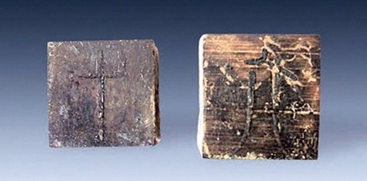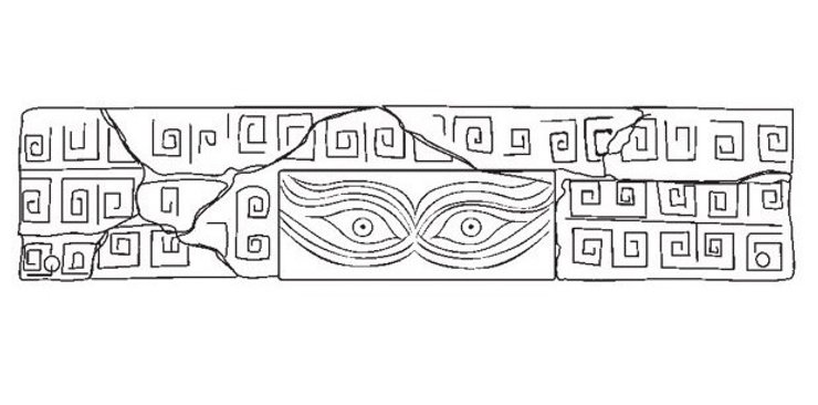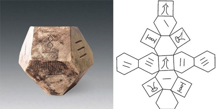 Среди найденных вещей: четырнадцатигранная кость, сделанная из зуба животного, двадцать один кубик, на гранях которых вырезаны цифры, а также часть разбитой игровой доски, украшенная изображением двух глаз и геометрическими фигурами.
