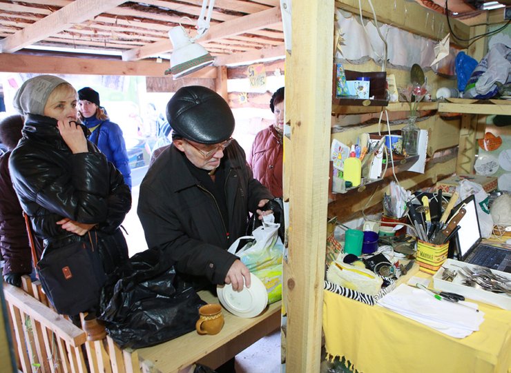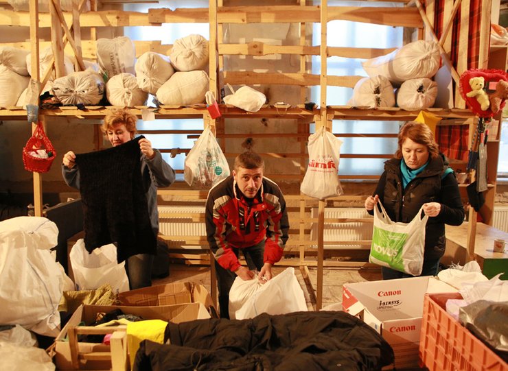 На выходных здесь все еще можно увидеть очереди беженцев из Луганской и Донецкой областей, которым волонтеры помогают продуктовыми наборами, одеждой, медикаментами, кухонной утварью. Но очереди уже гораздо меньше, чем были. Последние два месяца тут относительное затишье.