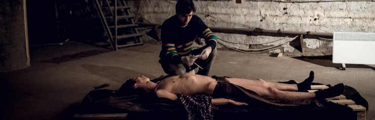 Время от времени экран гаснет. И тогда внимание зрителей сосредотачивается на молодом человеке в серой шапочке (в зале прохладно), который комментирует происходящее. Из комментариев ясно, что умирающий мужик — сепаратист. Актер рассказывает о том, как военные медики хотели кого-то спасти, но не спасли. Или как не хотели, но спасли. Текст звучит подчеркнуто буднично, события излагаются безоценочно. И все же чувствуется, что актер сопереживает экранным героям, в том числе и раненому сепаратисту. Под экраном лежит тело — солдат в камуфляже. В какой-то момент парень в шапочке быстрыми профессиональными движениями разрезает камуфляж — так снимают одежду с раненого санитары. И совершенно голый мужчина продолжает неподвижно лежать перед зрителями. Все это действо называется пьесой "Товар".