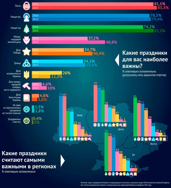 В мае общество почти разделилось на тех, кто считает майские выходные праздником, и тех, кто относится к ним как к наследию советского прошлого. На самом деле 1–2 и 9 Мая занимают лишь шестую и восьмую позиции в рейтинге важности праздников у украинцев. Из девяти* основных государственных праздников — гражданских и церковных — самыми главными украинцы считают Рождество и Пасху. Кстати, по сравнению с 2013 годом важность праздников для украинцев явно уменьшилась, за исключением разве что Дня независимости и Дня Конституции