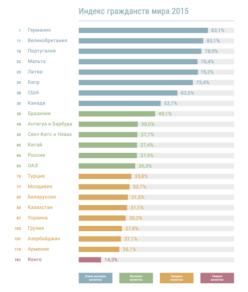 Всего эксперты ранжировали 182 гражданства по разным показателям за период с 2011 по 2015 год.