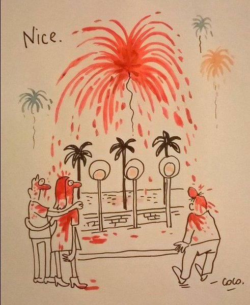 На рисунке изображена Английская набережная в Ницце, кровавый салют и шокированные люди, забрызганные кровью.