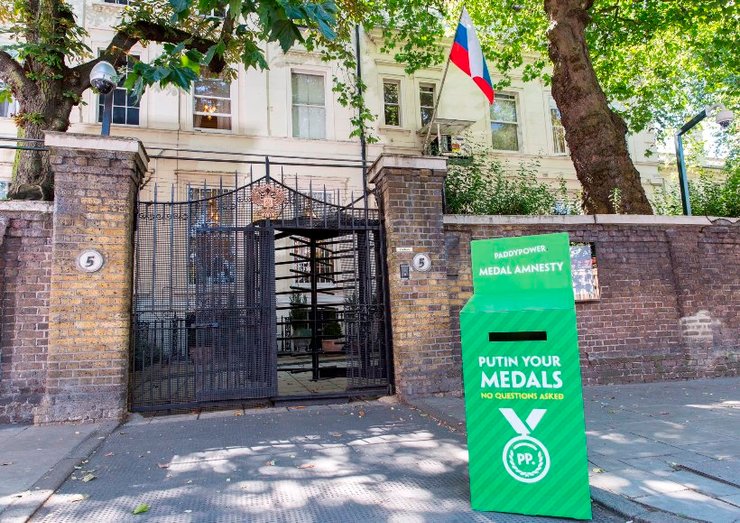 Британская букмекерская контора Paddy Power установила у посольства РФ в Великобритании коробку для возврата медалей, призвав российских спортсменов вернуть награды, добытые нечестным путем.