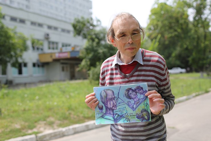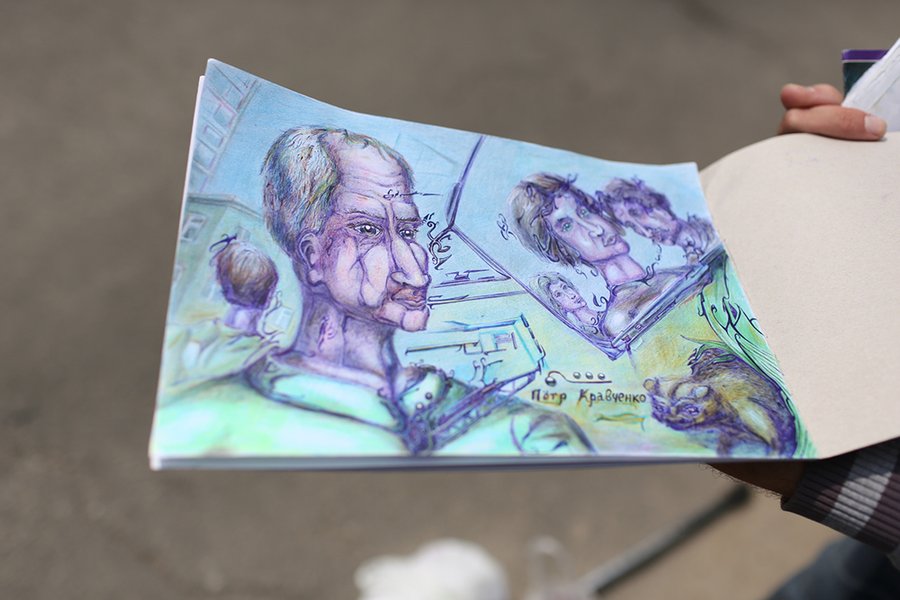 — Я счастлив, только когда рисую. Ради этого, по большому счету, и живу. Правда, рисовать в последние годы становится все сложнее. Четыре года назад правый глаз совсем перестал видеть, а левый видит процентов на 35–40. Я рисую с лупой (Петр достает из сумки, спрятанной под футболкой, большое увеличительное стекло и альбом для рисования. — Фокус). Зато в очках хорошо вижу светящиеся предметы — мониторы, экраны телефонов. Когда я смотрю на город в новостях, вижу его лучше, чем когда иду по нему.