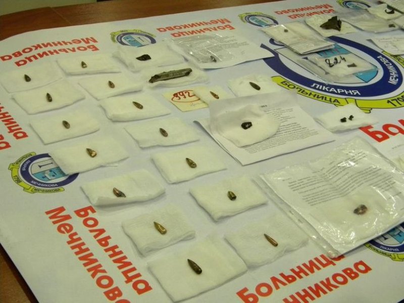 Медики Днипра собрали автоматные пули, пули от винтовок, толстенные тяжелые осколки от артиллерии, осколки от "Града". Также имеются части и от запрещенных Минском 120-мм мин, танковых снарядов и боеприпасов. Об этом сообщает sobitie.com.ua.