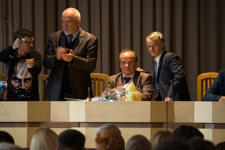 Наконец в зал заходит Мустафа Джемилев, его провожают в президиум, приходит время речей. Казарин вкратце напоминает о том, что ТНУ корнями из Киева, затем передает слово первому заместителю министра Владимиру Ковтунцу. Тот очень рад тому, что, несмотря на бюрократические преграды, университет все же открылся в столице, и долго благодарит всех, кто приложил к этому усилия. Ректор передает микрофон Джемилеву, представляет гостя как легендарного человека особого мужества, который не сломался, отсидев 15 лет в одиночке. Депутат выходит к высокой трибуне, она невыгодно подчеркивает его рост — видна лишь голова. "После освобождения и проведения тщательной дезинфекции всех государственных структур автономии возникнет острая нехватка кадров. Этот университет будет готовить кадры для Крымской автономной республики", — говорит Джемилев и призывает не забывать, что крымчане в Киеве — гости, они должны будут вернуться домой. Следующий оратор, наоборот, предлагает крымчанам чувствовать себя в Киеве как дома, потому что "Украина — наша общая страна".