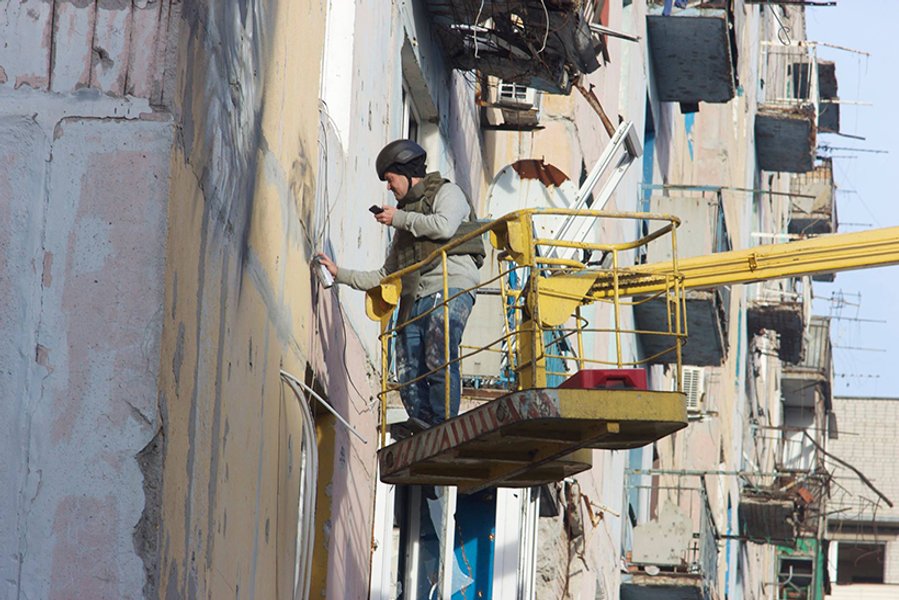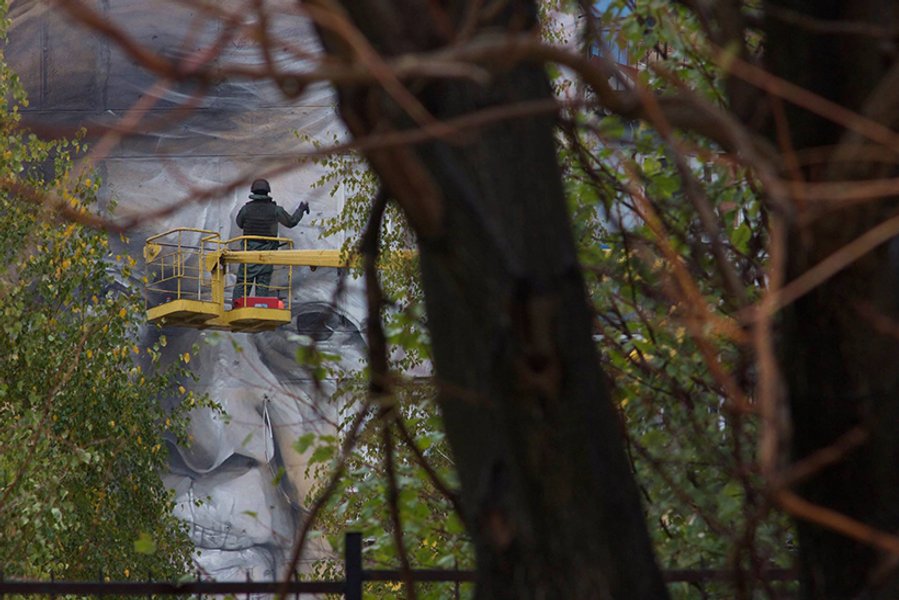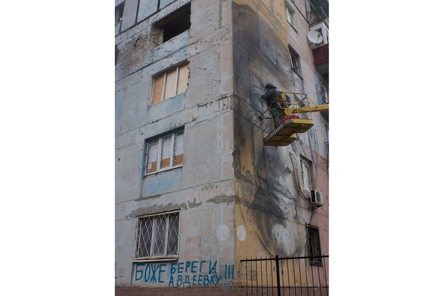 "Это портрет учительницы средней школы в Авдеевки, она преподает украинскую литературу. Во время обстрела Авдеевки в 2014 году ее мужа тяжело ранило в двадцати метрах от этого дома, где изображена фреска. Сам дом расположен перед "зеленкой", за которой находятся сепаратисты. Эта работа несет в себе огромную силу в выражении лица этого человека. Цель этой работы, привлечь мировую общественность к этой территории, где ежедневно гремят взрывы минометов. В течение этих двух дней пока мы рисовали, по украинской территории в двух километрах от нас было совершено более 100 ударов", – говорится в сообщении.