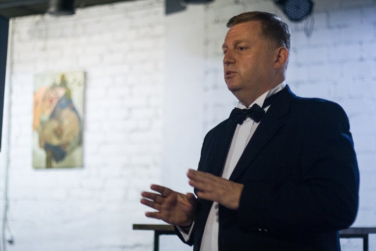 Львовянин Васыль Расевич расхаживает по темному залу харьковского клуба "Аrt-area "ДК", держа в одной руке чашку с кофе, в другой — блюдце, на которое он ставит чашку после каждого глотка. Что-то еще помимо костюма и бабочки выдает в нем опытного лектора, но что именно — уловить трудно.
