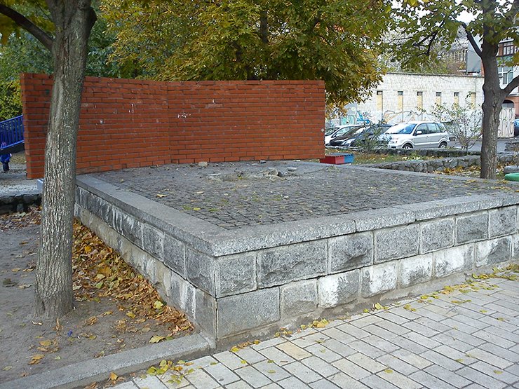 Фигуру человека с камнем снесли, а кирпичная стена, которая находилась позади нее, и постамент остались на своем месте.