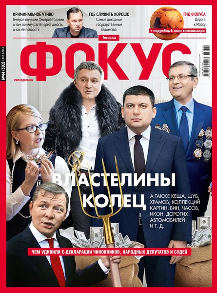 В общем, свежий номер Фокуса, конечно же, посвящен электронному декларированию. Мы прошлись по е-декларациям четырех десятков топ-чиновников и политиков. Их доходы, недвижимость и транспорт, накопленные капиталы и официальные зарплаты — все собрали и сравнили с бумажными декларациями, которые они подавали весной этого года. Вдруг что-то появилось или исчезло. Не исчезло ничего, а вот появилось почти у всех. Здесь же — рейтинги самых богатых чиновников и самых необычных задекларированных объектов. Плюс рейтинг органов власти — оказалось, самые высокий средний доход у руководства Нацбанка, самый низкий — у судей Конституционного суда.