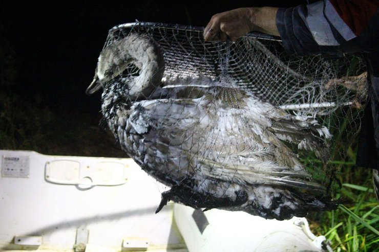 Операция проходит успешно: ослепленный фонарями лебедь плывет прямо в руки Миши. Он ловит его большим сачком, достает из воды. Лебедя везут к специалистам, которые лечат птиц, попавших в беду.