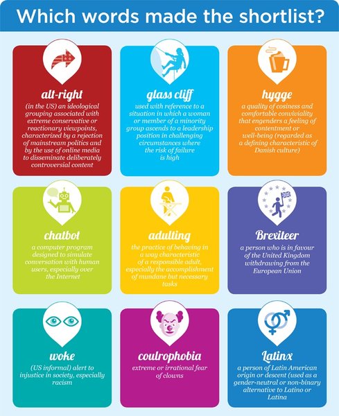 Составители словаря опубликовали также список слов, которые в этом году претендовали на статус слова года. В него вошли, в том числе, brexiteer – человек, поддерживающий выход Великобритании из ЕС (Brexit), chatbot – компьютерная программа, предназначенная для имитации разговора с человеческими пользователями, coulrophobia – панический страх перед клоунами, а также новый нейтральный (без гендерной привязки и без негативного смысла) термин для обозначения латиноамериканцев – latinx.