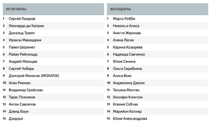 Также пользователи Яндекса своим интересом определили мужчину и женщину года. Среди мужчин на первом месте конкурент Джамалы на Евровидении Сергей Лазарев, а женщиной года стала актриса Марго Роби, сыгравшая Харли Квин в фильме "Отряд самоубийц".