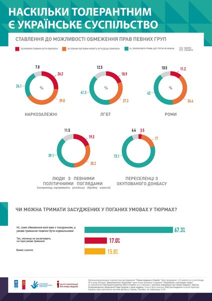 66,1% опрошенных украинцев поддержали ограничение прав наркозависимых, 47,6% - цыган, 20,5% - переселенцев из Донбасса. За ограничение прав людей с определенными политическими взглядами выступают 49% опрошенных (19% - "безусловно" и 30% - "при определенных обстоятельствах").