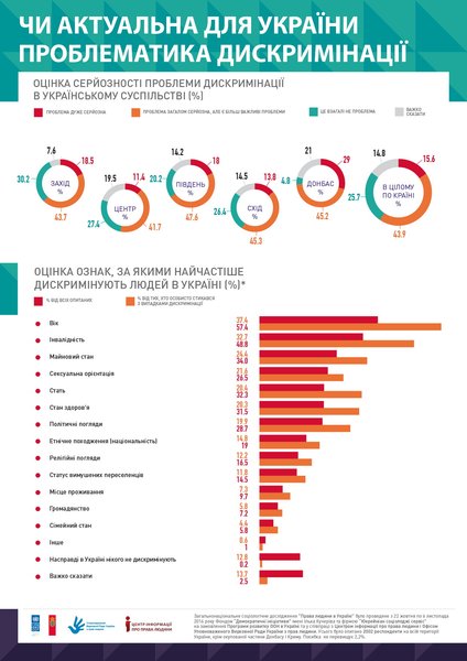 Больше всего людей, которые чувствуют в отношении себя дискриминацию, сообщают, что страдают от притеснений по возрасту, по инвалидности, по имущественному положению и сексуальной ориентации. В том, что на самом деле в Украине никого не дискриминируют, убеждены почти 13% опрошенных.