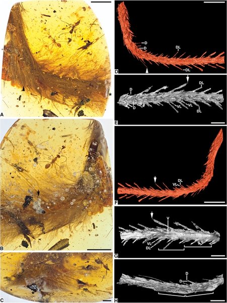 Китайские палеонтологи обнаружили в Мьянме янтарь, в котором сохранился покрытый перьями фрагмент хвоста динозавра, предположительно из отряда тероподов. Исследование опубликовано в Current Biology, передает N+1.
