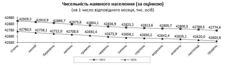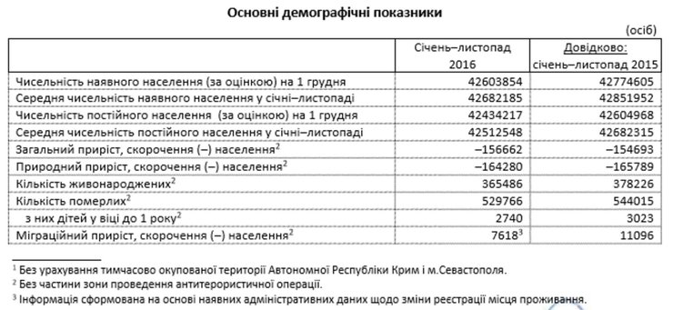 Численность населения Украины по состоянию на 1 декабря 2016 с 1 декабря 2015 уменьшилась на 170,7 тыс. человек (0,4%) и составила 42,6 млн человек.