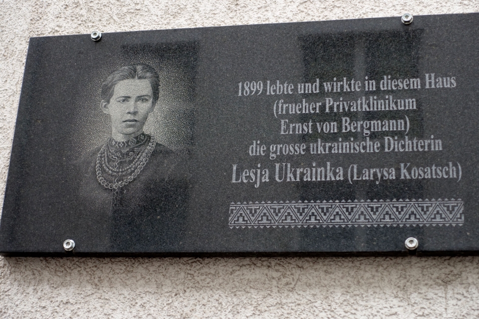 Мемориальная доска работы полтавского скульптора Вадима Голобородова установлена как раз на доме, где ранее находилась частная клиника Эрнста фон Бергманна. Она была открыта 30 августа 2010 года, к 140-летию со дня рождения поэтессы по инициативе Центрального союза украинцев в Германии.