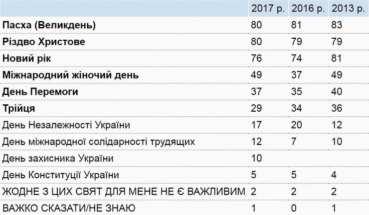 Киевский международный институт социологии провел собственный опрос с 10 по 19 февраля 2017 года, опросив 2040 человек во всех областях Украины за исключением оккупированных территорий. Респонденты могли выбрать не больше пяти любимых праздников.