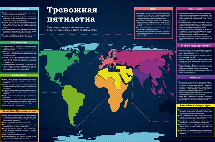 Фокус предлагает ознакомиться с основными тезисами доклада Национального разведывательного совета США "Глобальные тренды: парадокс прогресса", посвященного тому, как будут развиваться политика и международные отношения в мире в ближайшие пять лет. Такой прогноз впервые был опубликован в 1997 году и с тех пор выпускается каждые четыре года. За это время в анализе глобальных трендов американские разведчики еще ни разу не ошиблись.