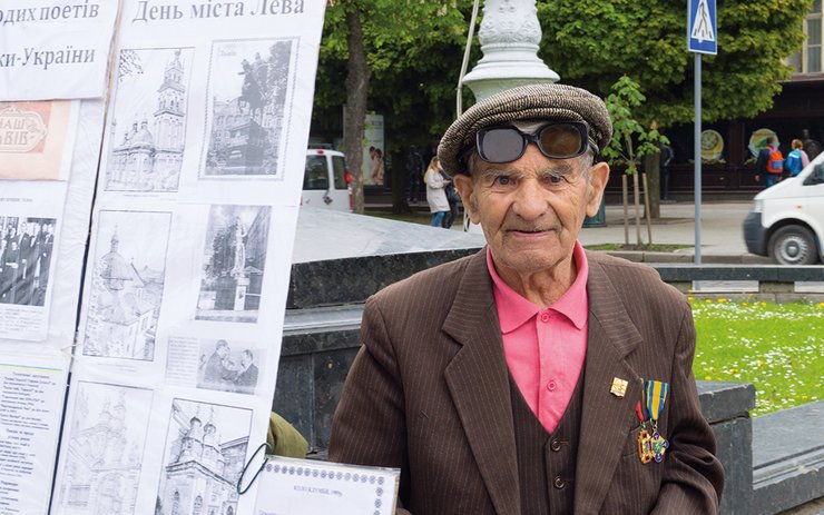 В разговорах о счастье народов мы вышли на площадь перед главным зданием Оперы. Дедушка Микола с орденами на груди сидел возле стенда, на котором распечатанные на принтере черно-белые документы рассказывали прохожим об истории Львова. Это был первый человек, которого мы хотели спросить о счастье, поэтому немного волновались. Вопрос-то необычный. Но услышав наши слова о том, что мы исследуем счастье, правда, с третьего раза, поскольку Микола плохо слышал, ветеран разулыбался и ответил:
