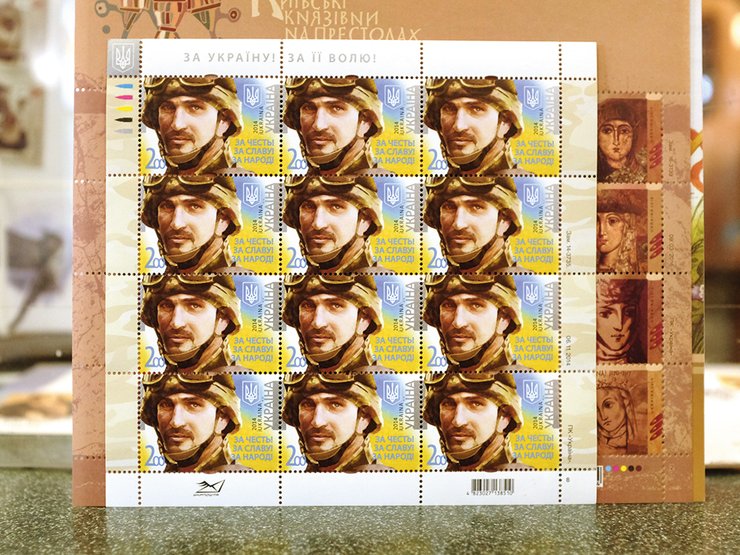 — Однажды подходит молодой человек: "Хочу купить себя". Выяснилось, что это военный с позывным Француз, с фото которого рисовали почтовый знак героям АТО. Теперь у него новый позывной — Марка, — подавая листы с Французом, улыбается продавец.