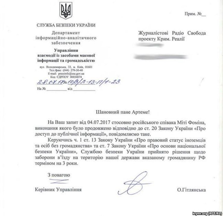 "Руководствуясь ч.1 ст.13 Закона Украины "О правовом статусе иностранцев и лиц без гражданства" и ст.7 Закона Украины "Об основах национальной безопасности Украины", Служба безопасности Украины приняла решение о запрете въезда на территорию нашего государства указанном гражданину РФ сроком на 3 года", – сказано в документе.