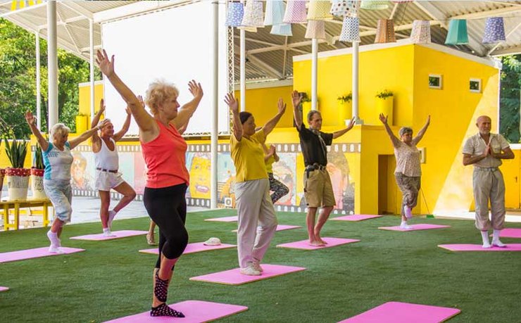 Стены теплого желтого цвета ограждают здешний уют от остальной части шумного и гудящего Гидропарка. Тут душевно, но ни в коем случае не скучно. Атмосфера веселая, энергичная и радостная. На креслах в горошек качаются очаровательная блондинка в ярко-малиновом платье и джентльмен в сдержанной рубашке и брюках. Они только что занимались йогой. Около них в асанах стоял подтянутый мужчина с шоколадным загаром. Все трое непринужденно улыбаются, беседуя о планах на вечер. Это картинка из крытой зоны для йоги.