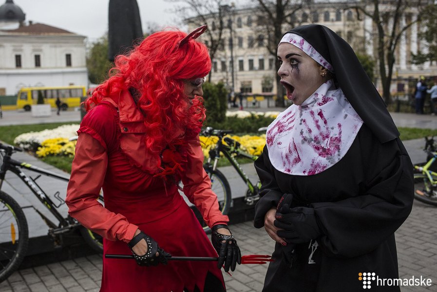 Участники в ярких костюмах и гриме со стилизованными топорами и метлами проехались на своих велосипедах по улицам столицы. Таким образом, организаторы действа пригласили отпраздновать "самое ужасное и веселое событие октября".