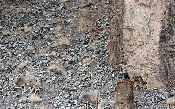 А однажды, после шестичасовой засады, фотографы сняли невероятно редкие кадры охоты барса на голубых баранов. Рассматривая фотографии, Ингер обнаружила, что они отлично иллюстрируют способность барсов маскироваться в горах. Один из таких снимков она опубликовала в Twitter с подписью "С ума сойти. Найдите барса".