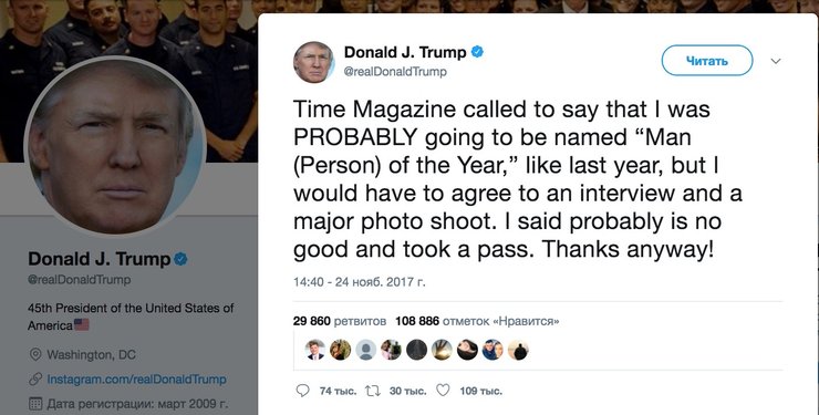 "Журнал Time позвонил, чтобы сказать, что меня, вероятно, назовут "Человеком года", как и в прошлом году. Однако в таком случае мне бы пришлось согласиться на интервью и крупные фотосъемки. Я сказал, что это не годится и отказался. В любом случае спасибо", – написал он.