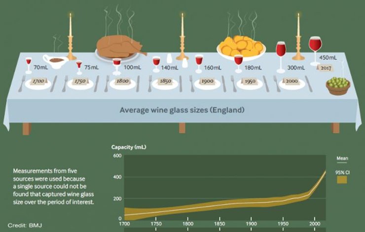 За последние 300 лет бокал для вина в Англии вырос в 7 раз
